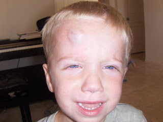 Man, oh man, that had to hurt!!! You better keep him under wraps in case someone calls social services on you!=) I can remember those days (not days where social services was called on me) but days where those big ol' bumps on the head happened. OUCH!