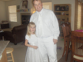 Baptism and birth day, that is. Our precious oldest girl turned 8 today and got to be baptized on her birthday. She (ok, WE) had lots of people here to help her celebrate. She looked like a princess in her beautiful white baptism dress (a loaner--thank you, Bodily's). And she only had to get dunked once. Uh, if you're not a mormon, that won't mean much to you. Skip it. One highlight (in my opinion) was the Billy Bob teeth, pictured here a few times. Daughter #2 got the most enjoyment out of them and seemed to really know how to wear them. Figures she'd be a natural.