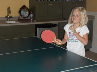 This is what it looks like when a normal person tries to play ping pong with Hallie. Dontcha just love Hallie's "oops, did I do that" face??