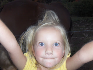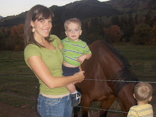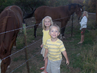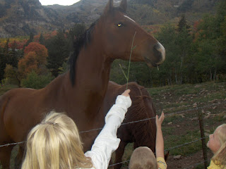 For our very first Monday family night together in Utah, auntie Lyssa took us for a jaunt up through Provo Canyon so we could check out the purty autumn colors before they're gone. We couldn't resist stopping when we saw the cute little horsies (worthheees, as Lucas would say) alongside the road. I think my favorite part about these pictures is the way the flash made the horses look like some sort of evil alien creatures ready to attack or swallow my children whole. (look at those yellow eyes! weird!) Wondering about Livvi's hair? She leaned too close to the barbed wire fence and a barb caught the front of her head and pulled the hair out of the bobby pins which had so neatly been placed in her hair. I wonder, why do I bother?